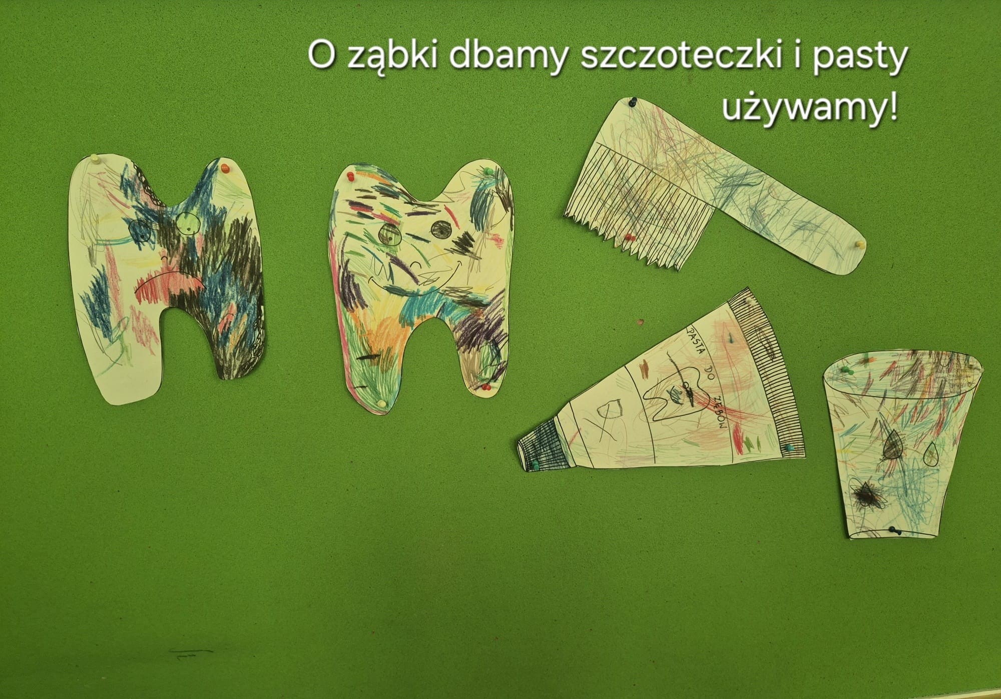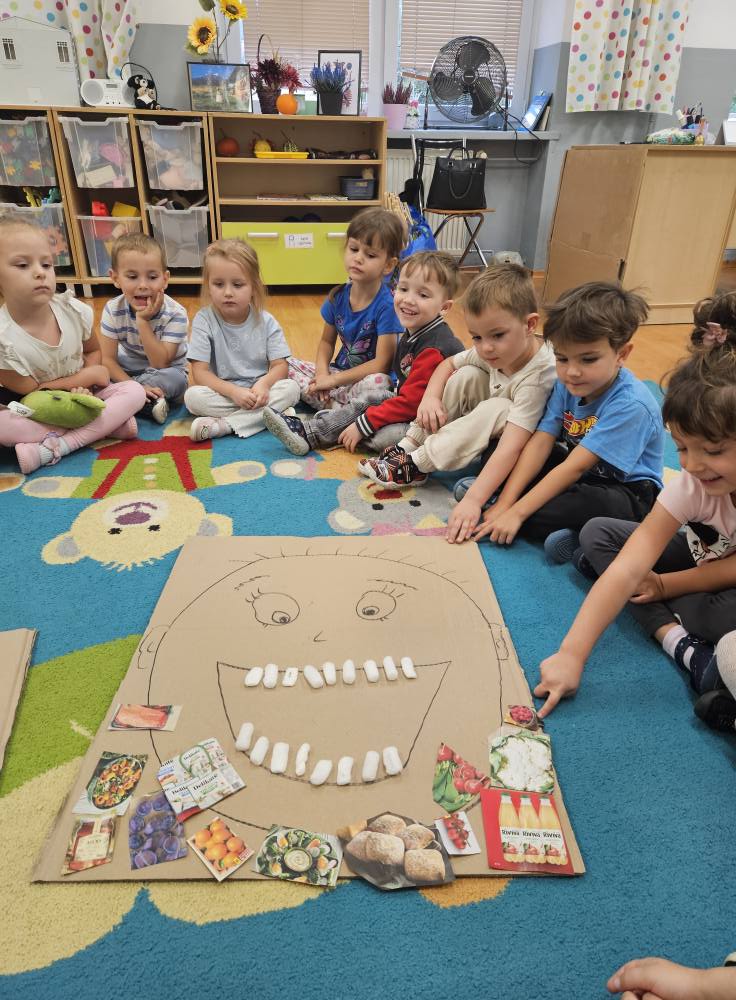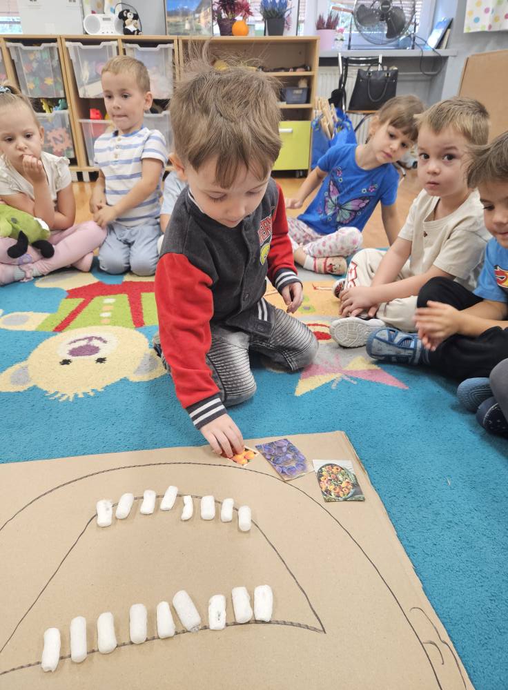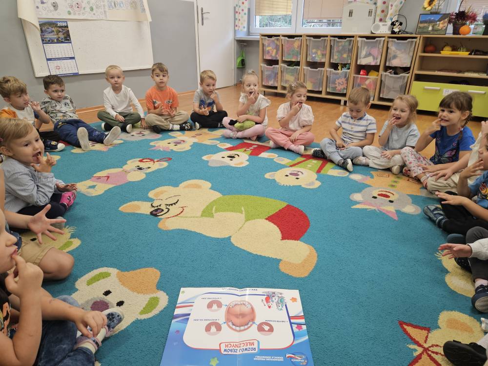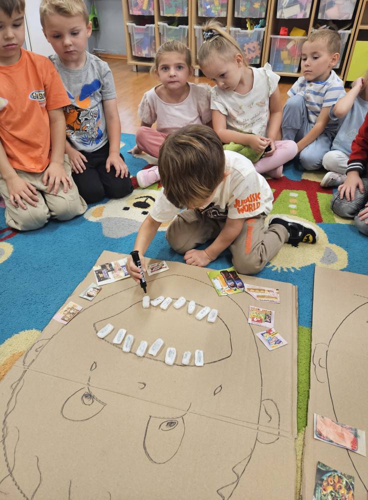 Przedszkolaki zgłębiały swoją wiedzę dotyczącą codziennego dbania o zdrowie zębów poprzez prawidłowe mycie ale także właściwe odżywianie . Dzieci wykonywały także  ćwiczenia logopedyczne usprawniające aparat mowy i przekonały się także, że zęby są niezbędne do prawidłowej realizacji głosek.