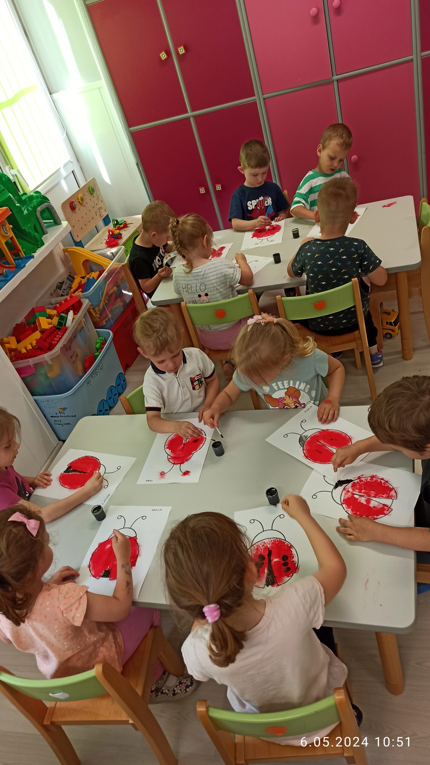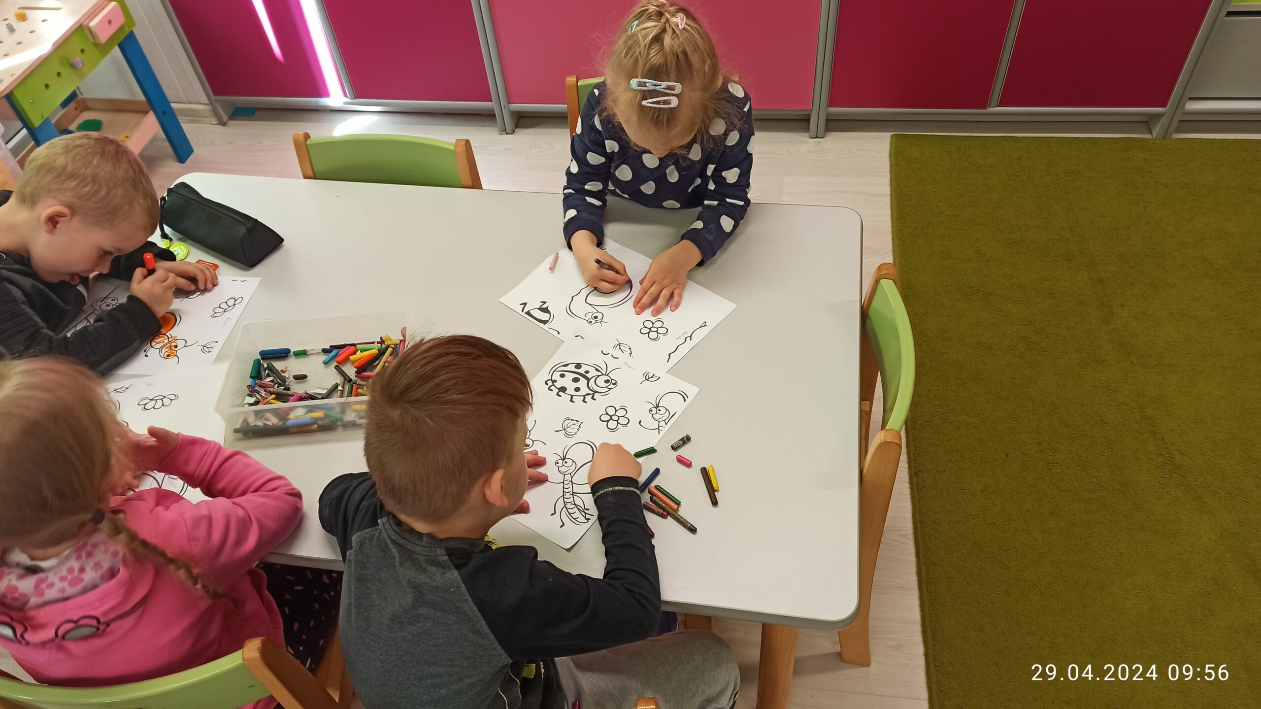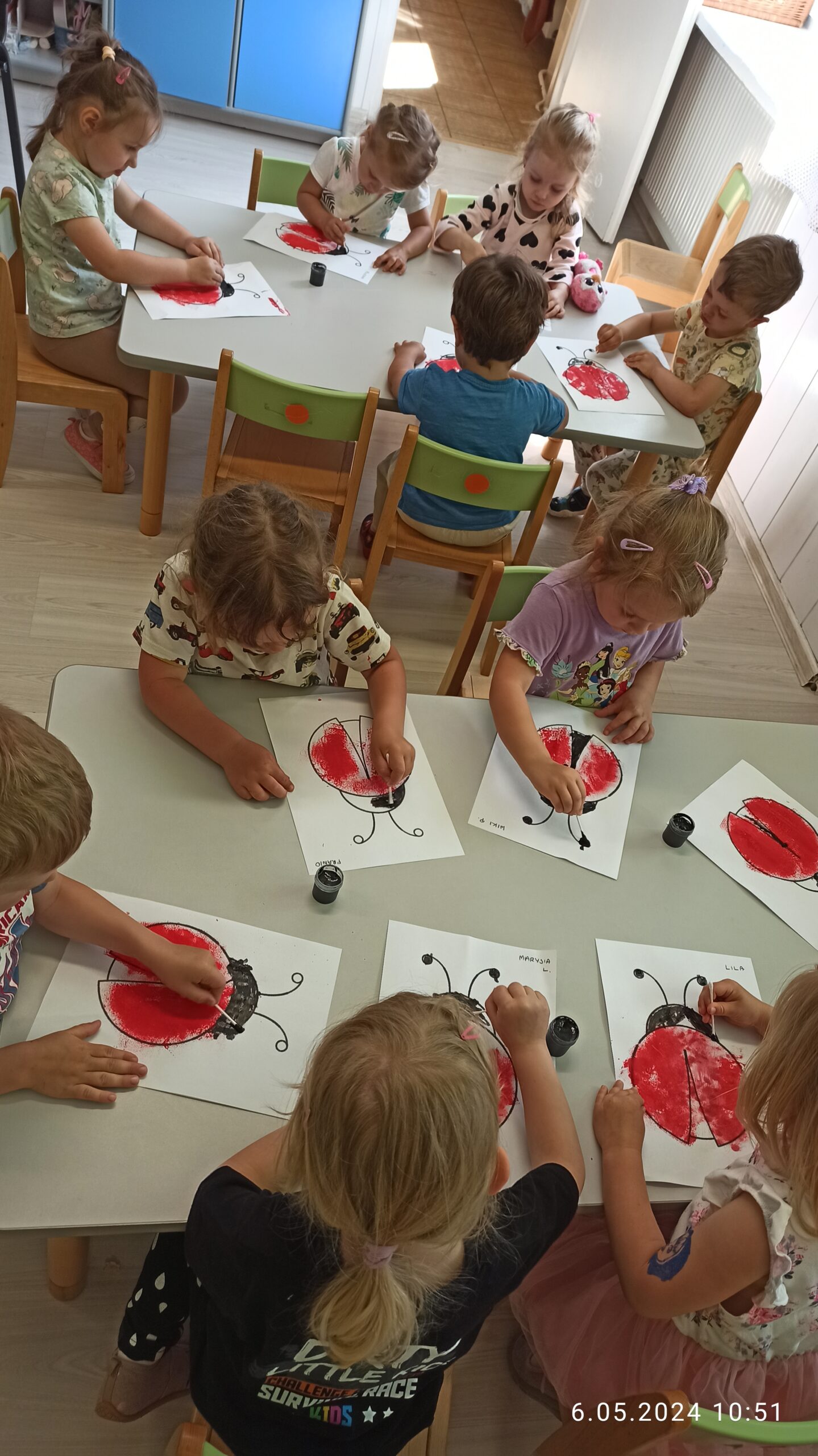 Wszystkie dzieci stworzyły puzzle XXL przedstawiające owady oraz wykonały metodą stemplowania biedronkę. W każdej pracy plastycznej dzieci uczą się planowania oraz zachowania porządku po jej zakończeniu.