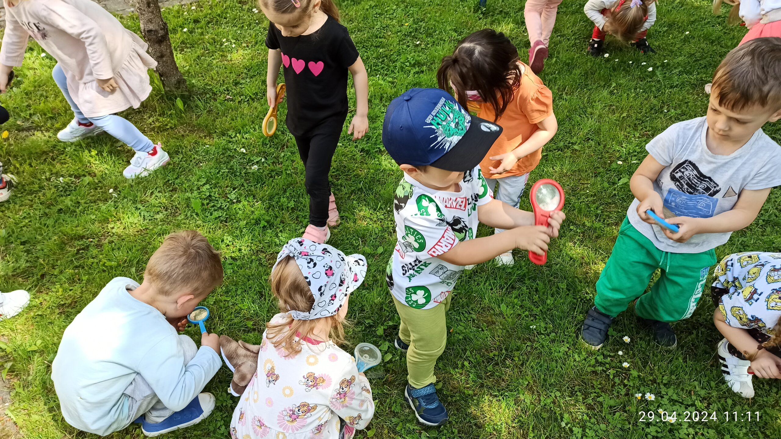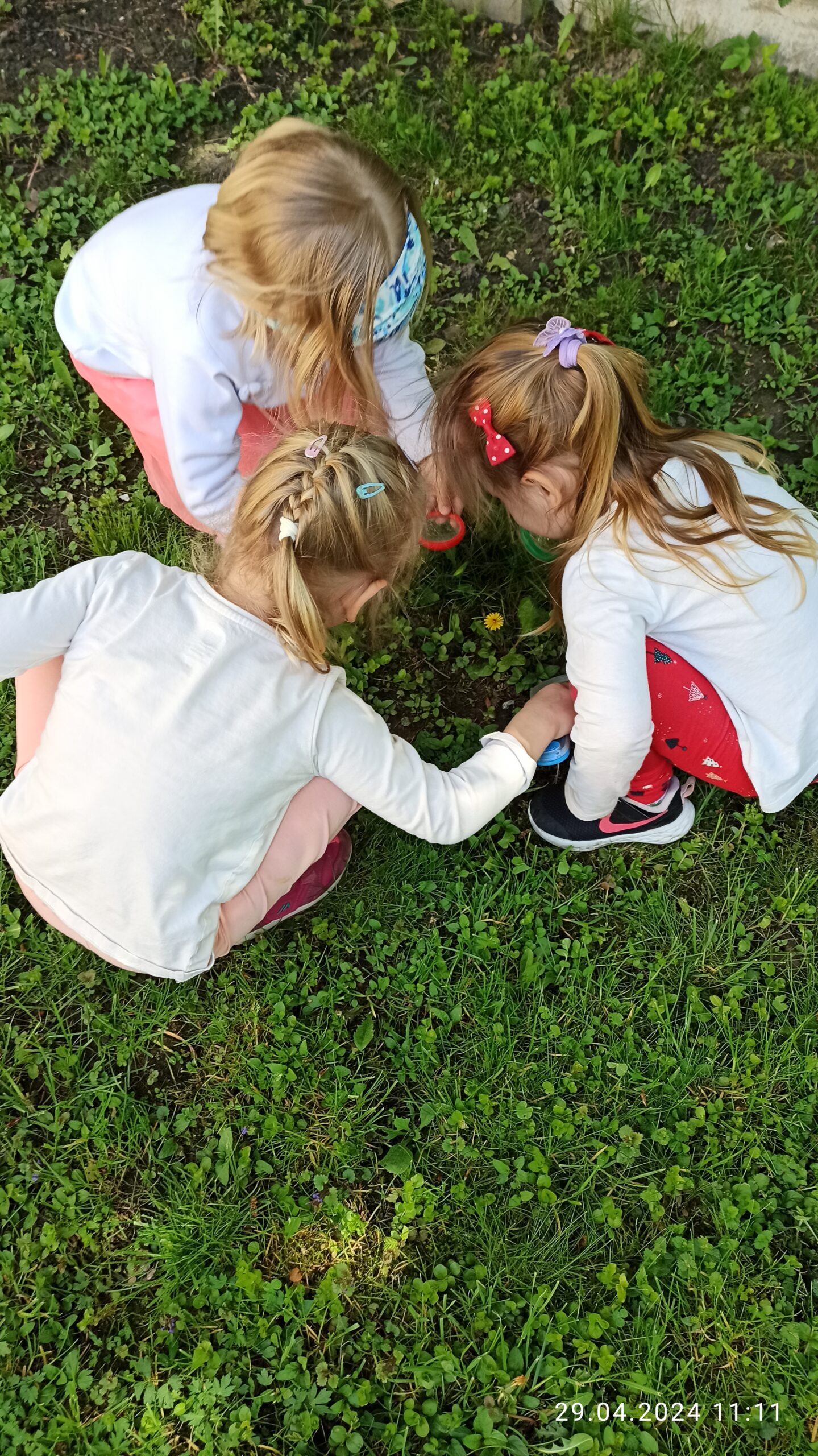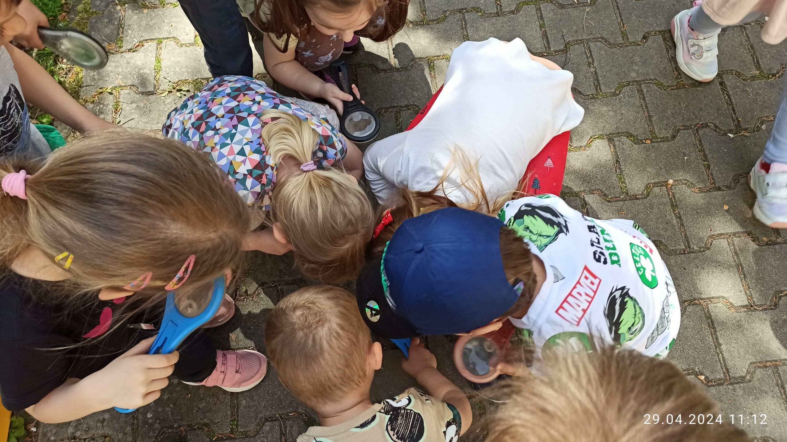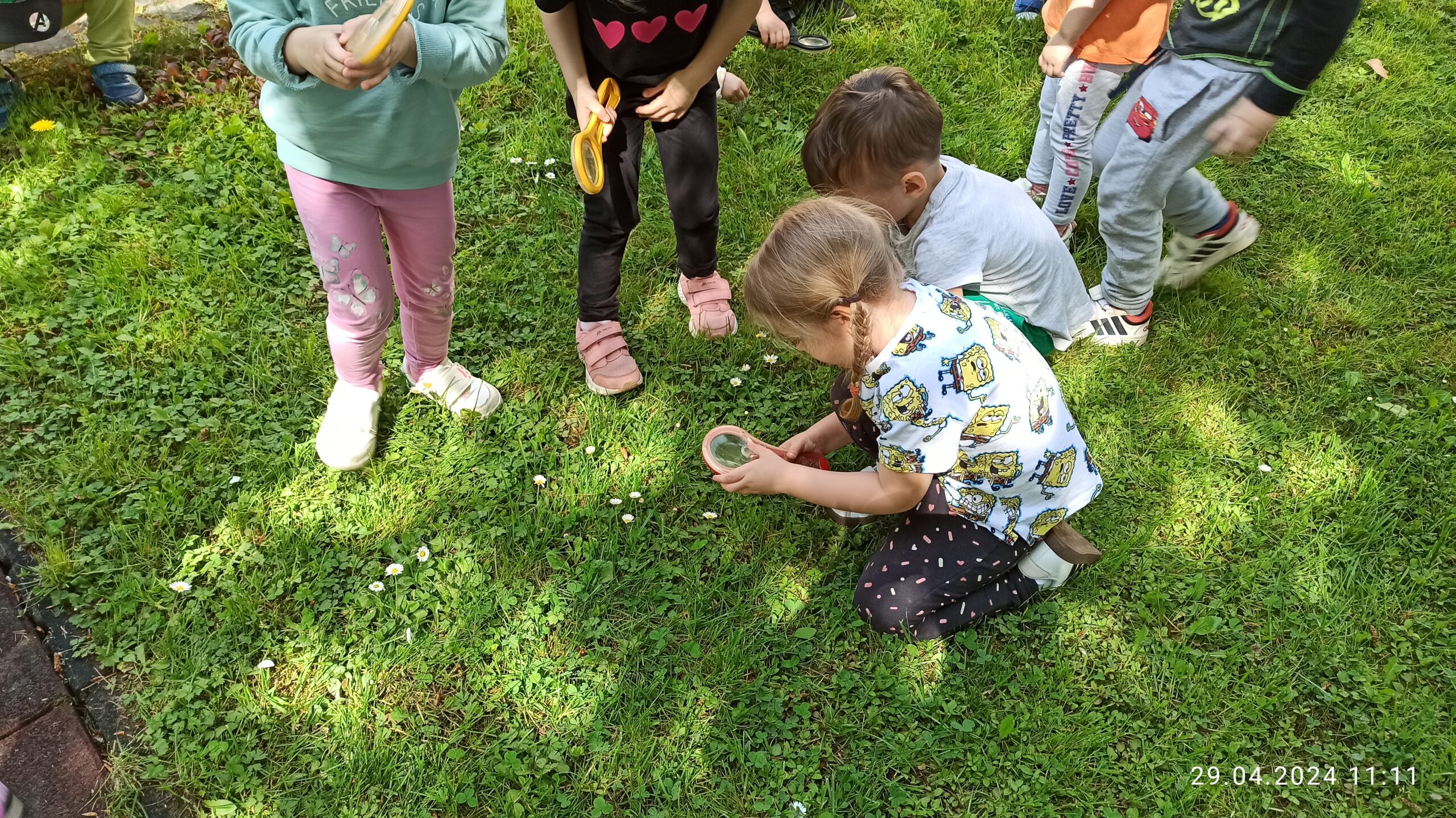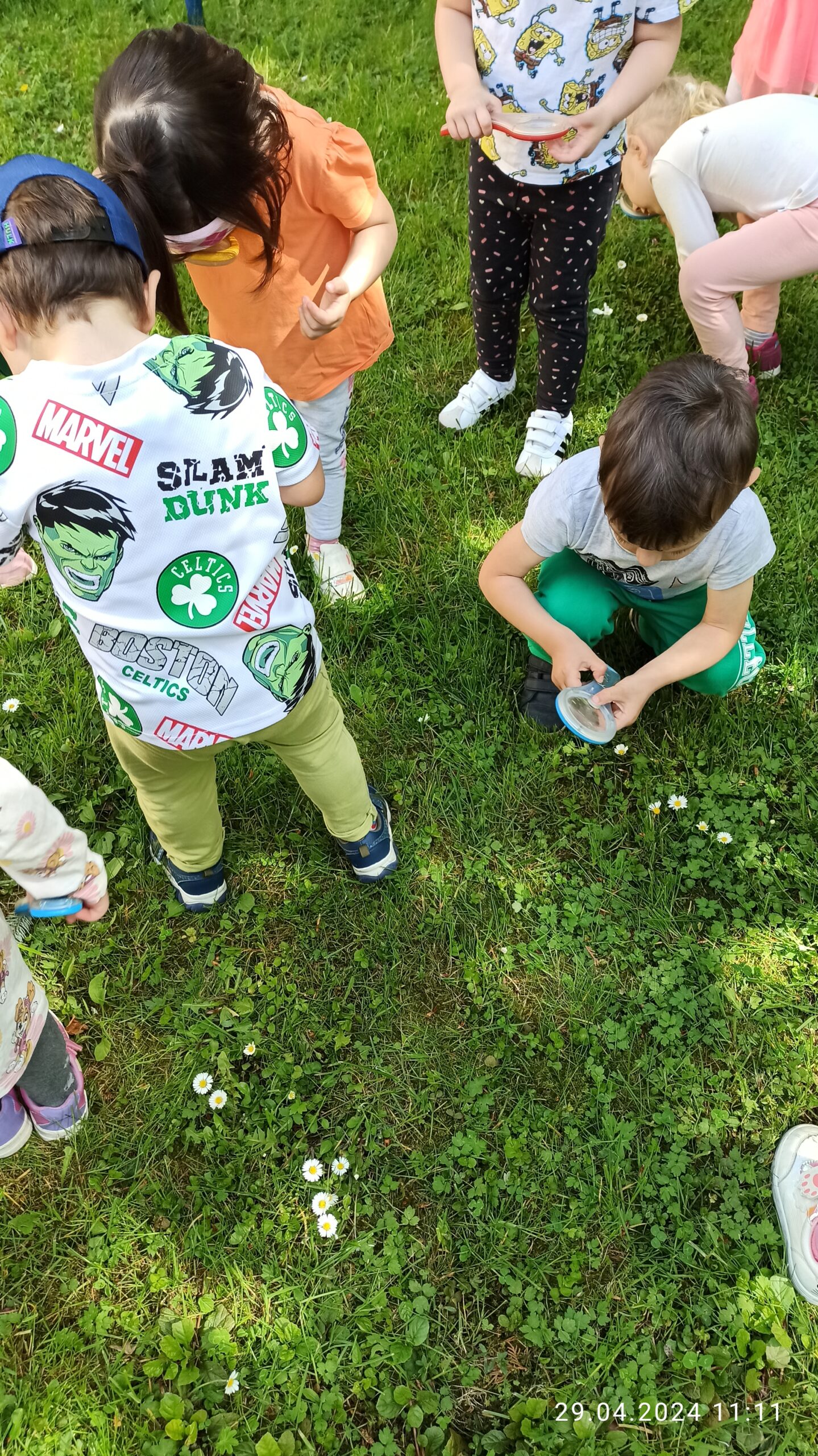 Korzystając z ładnej pogody, Krasnale mogły przeprowadzić obserwację badawczą. Dowiedziały się, że na łące mieszkają różne owady. Bardzo uważnie szukały m.in. mrówek, motyli, pająków. Już wiedzą, że nie trzeba się ich bać.