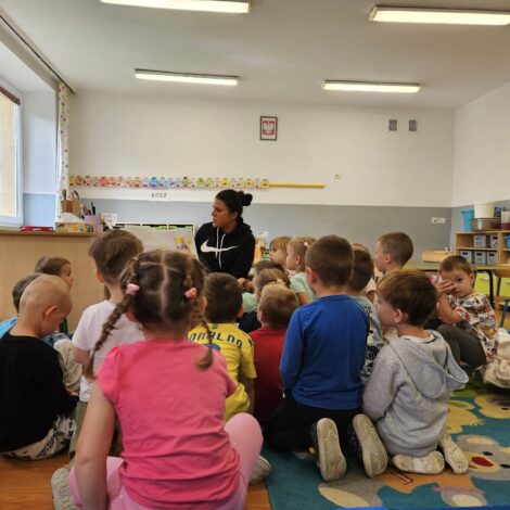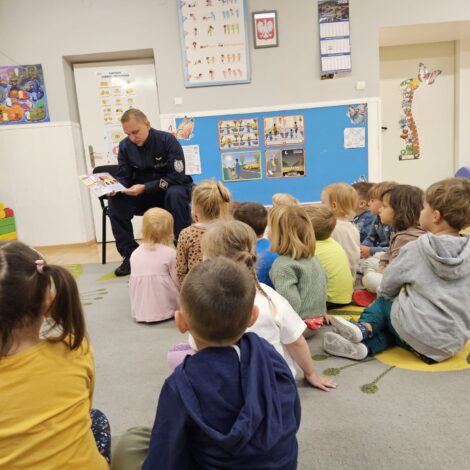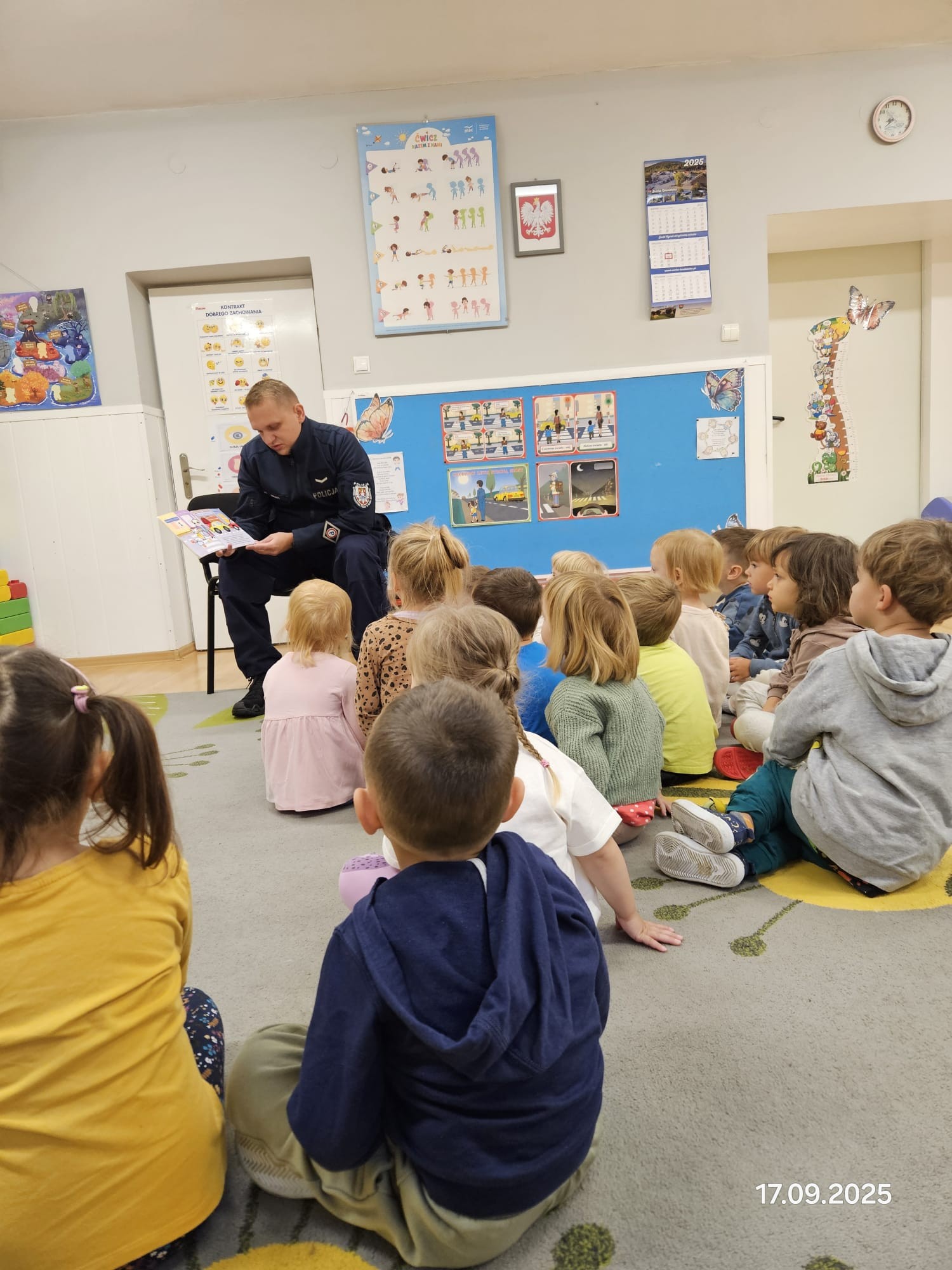• 17 września – grupa Motylki gościła dzisiaj tatę Blanki, który przeczytał przedszkolakom bajkę o Kici Koci, która zostaje….policjantką