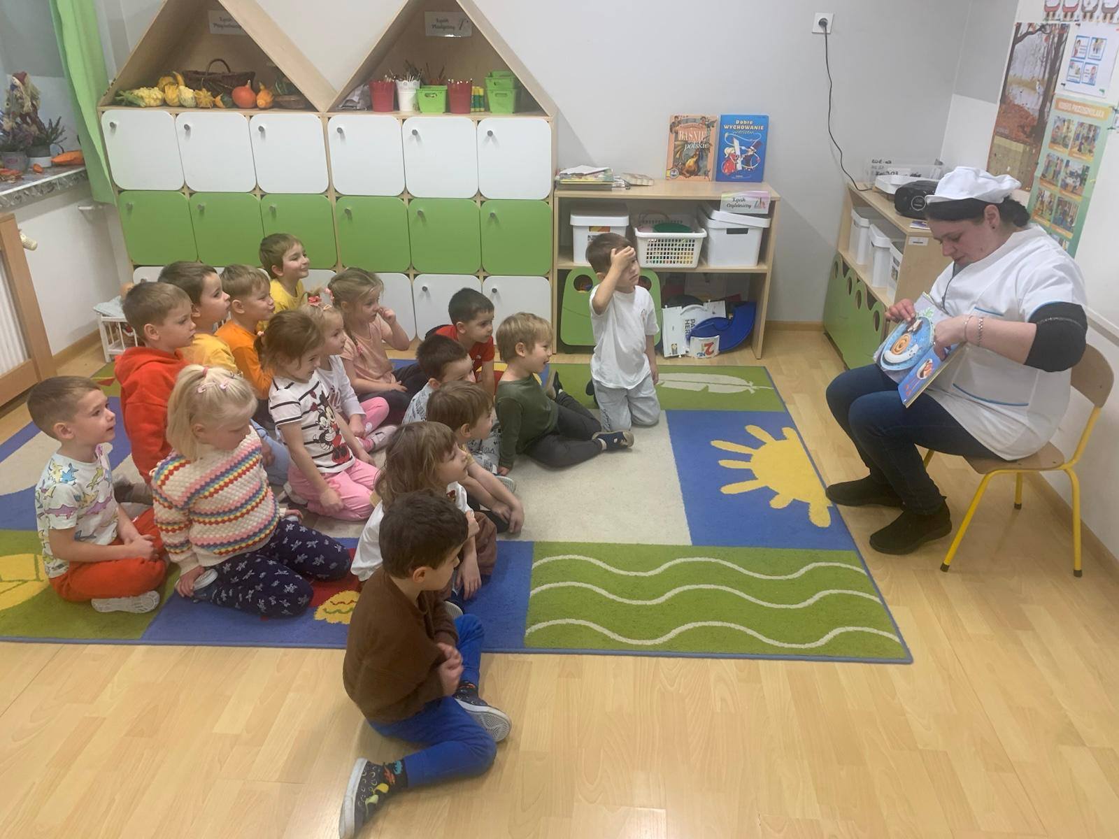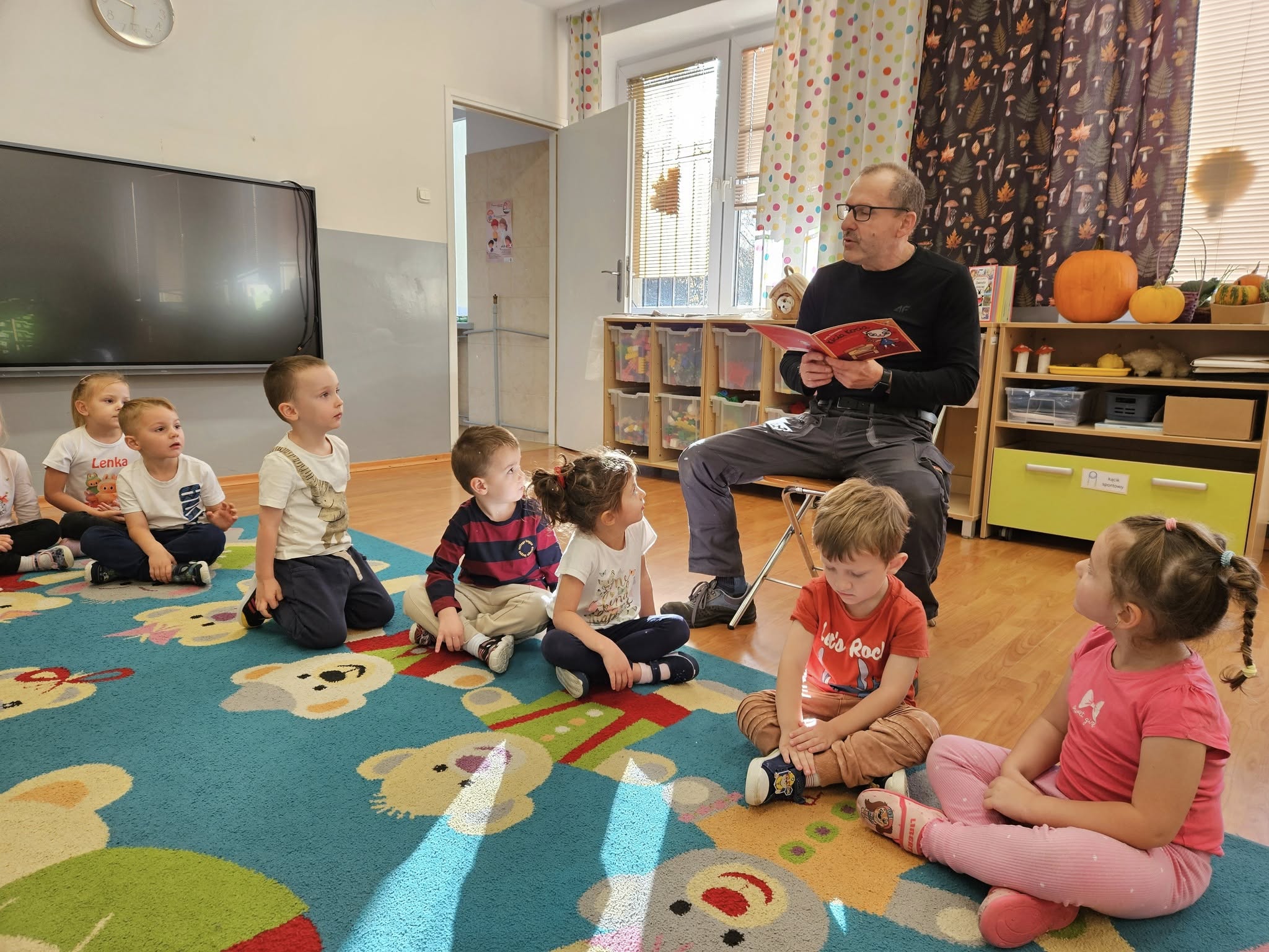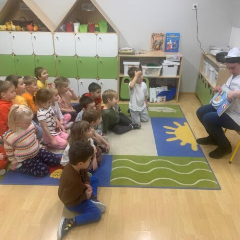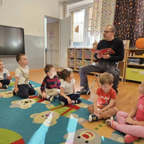 • 14 października – grupę Krasnale odwiedził Pan Michał – tata Lilianki, który przeczytał dzieciom przygody Kici Koci pt. „Witaminowe przyjęcie”. Przedszkolaki pięknie słuchały i dowiedziały się dlaczego warto wybierać owoce i warzywa zamiast słodyczy obiecały również, że będą wybierały zdrowe przekąski.