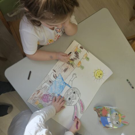 Grupy Żabki, Pszczółki, Misie, Zajączki realizowały w swoich zajęciach dydaktycznych tematy kompleksowe o bajkach, baśniach i legendach. Dzieci poznawały treści znanych i lubianych baśni, rozmawiały o ich bohaterach, morałach oraz o tym, czego możemy się z nich nauczyć. Przedszkolaki z dużym zaangażowaniem opowiadały o swoich ulubionych postaciach i wydarzeniach, rozwijając przy tym umiejętność swobodnego wypowiadania się i uważnego słuchania innych. Pszczółki wykonały również zakładki do książek podczas Dnia Kredki.