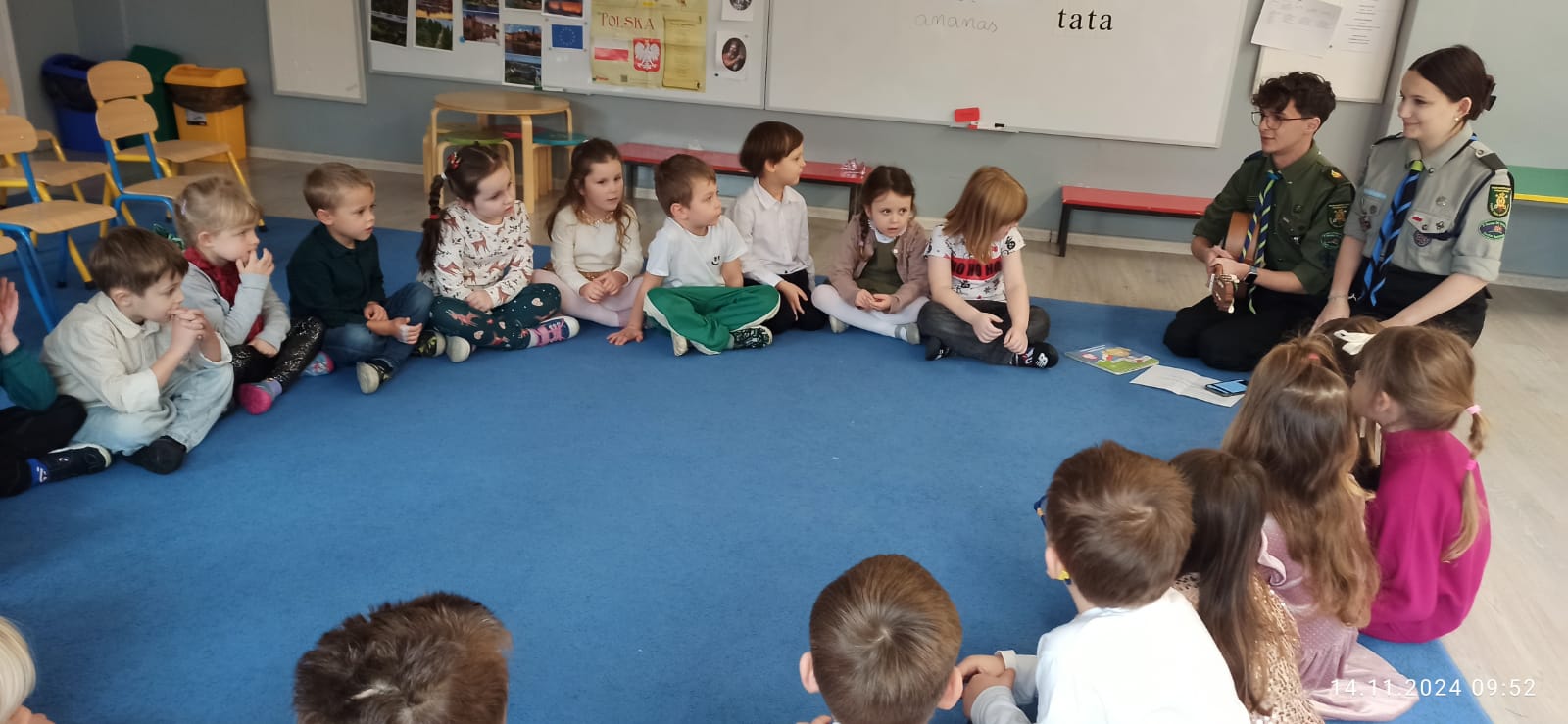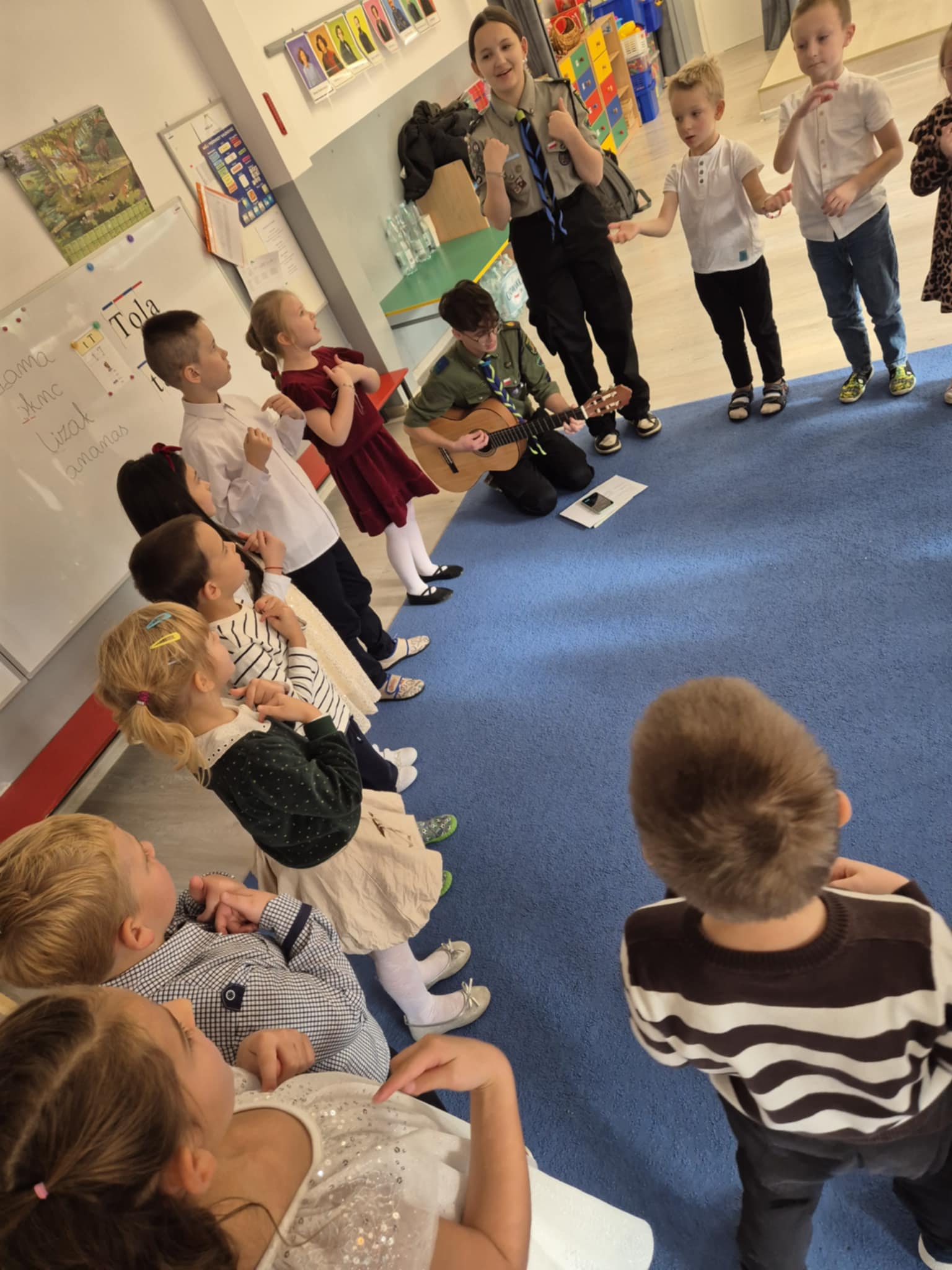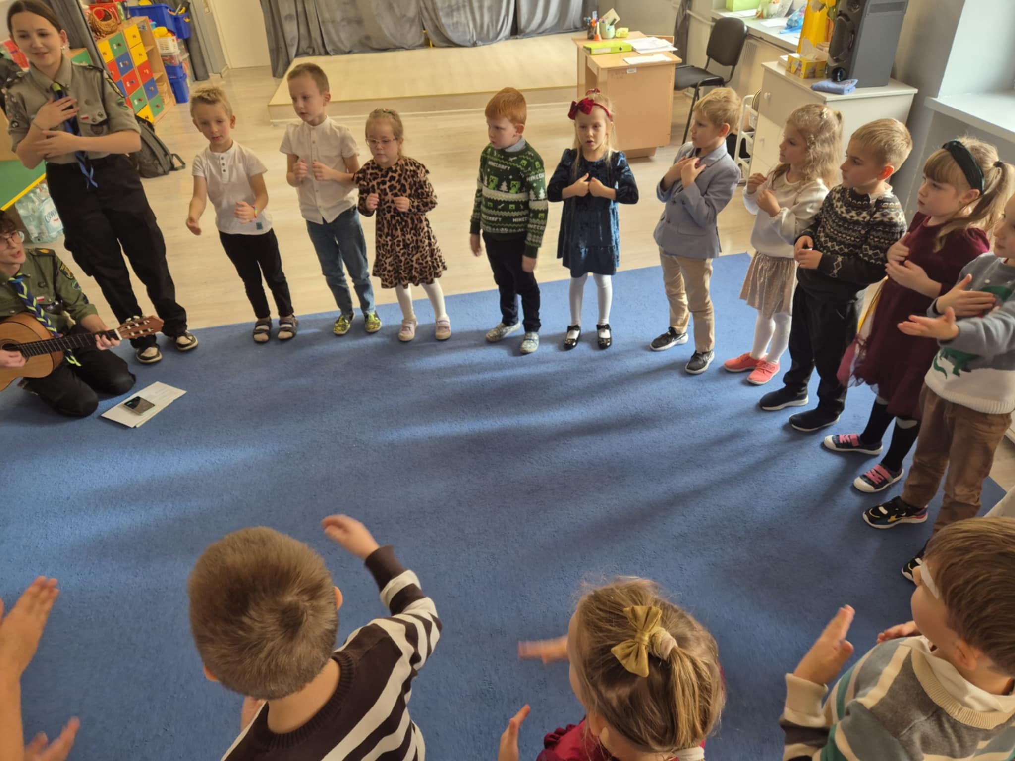 Jesienny szary dzień wcale nie musi być smutny i nudny. Przekonały się o tym dzieci ze starszych grup, kiedy nasze przedszkole 14 listopada odwiedzili niecodzienni goście – harcerze pwd. Tomasz Kot i pion. Joanna Ćwiklińska – 2 Szczep Drużyn Harcerskich Horyzont. Harcerze opowiedzieli dzieciom o swojej działalności i akcjach, w których biorą udział. Przedszkolaki dowiedziały się, kto może zostać harcerzem, czym charakteryzuje się strój harcerski oraz jak wyglądają obozy harcerskie. Nasi goście okazali się bardzo sympatycznymi i pełnymi energii ludźmi, więc spotkaniu towarzyszyły zabawy, tańce i śpiew przy akompaniamencie gitary. Spotkanie bardzo podobało wszystkim dzieciom. Niektóre z nich deklarowały, że w przyszłości też zostaną harcerzami. Dziękujemy wspaniałym harcerzom za przyjęcie naszego zaproszenia, poświęcony czas oraz ciekawe opowieści i zabawy.