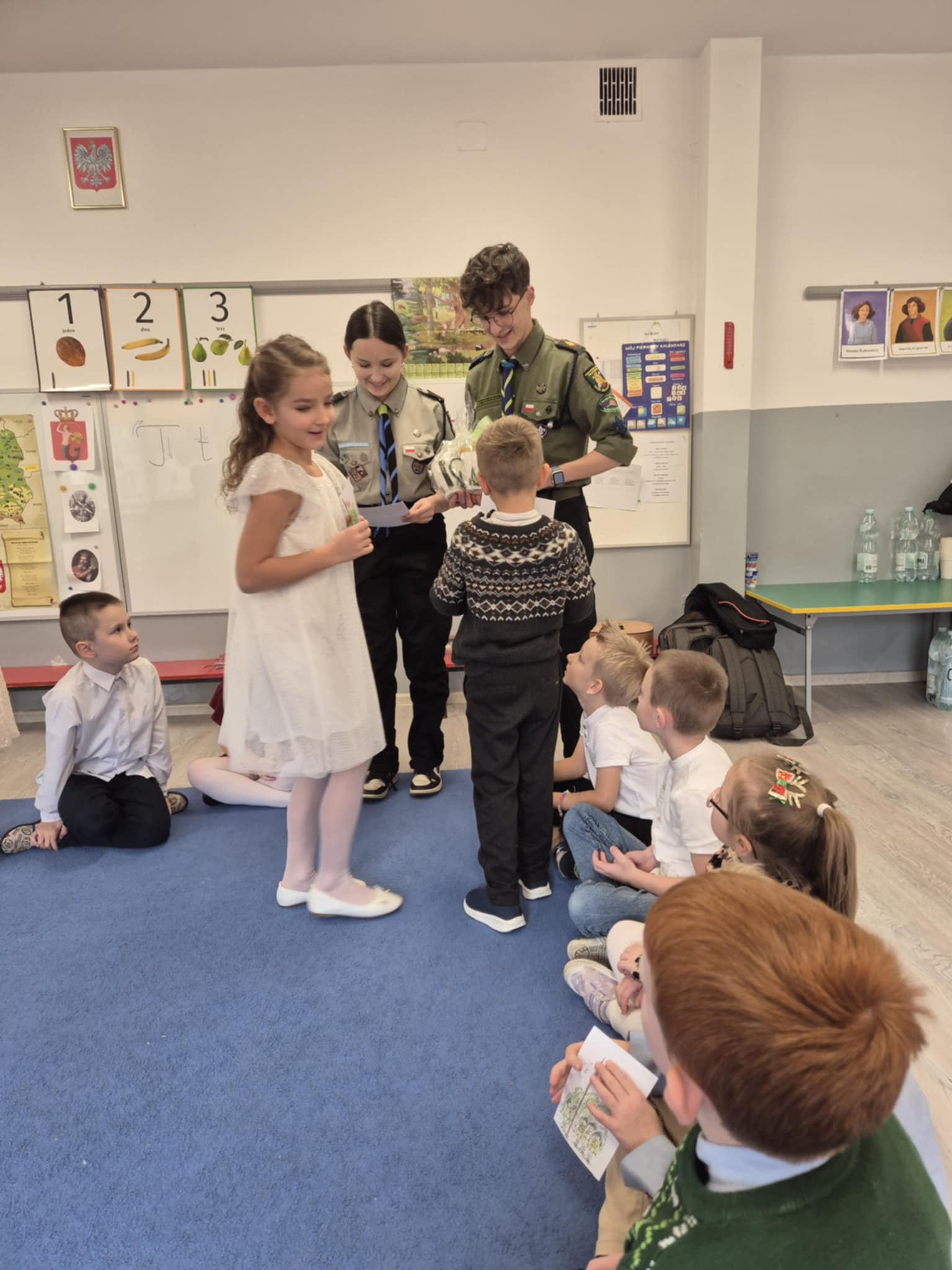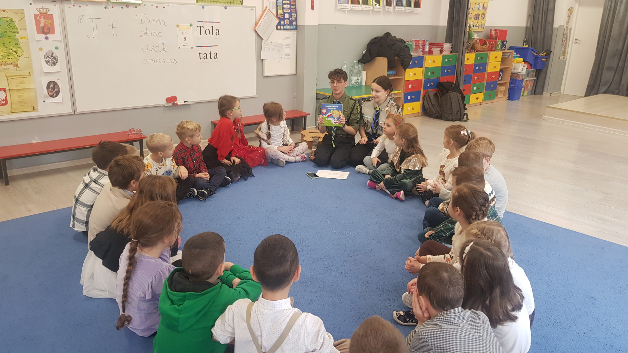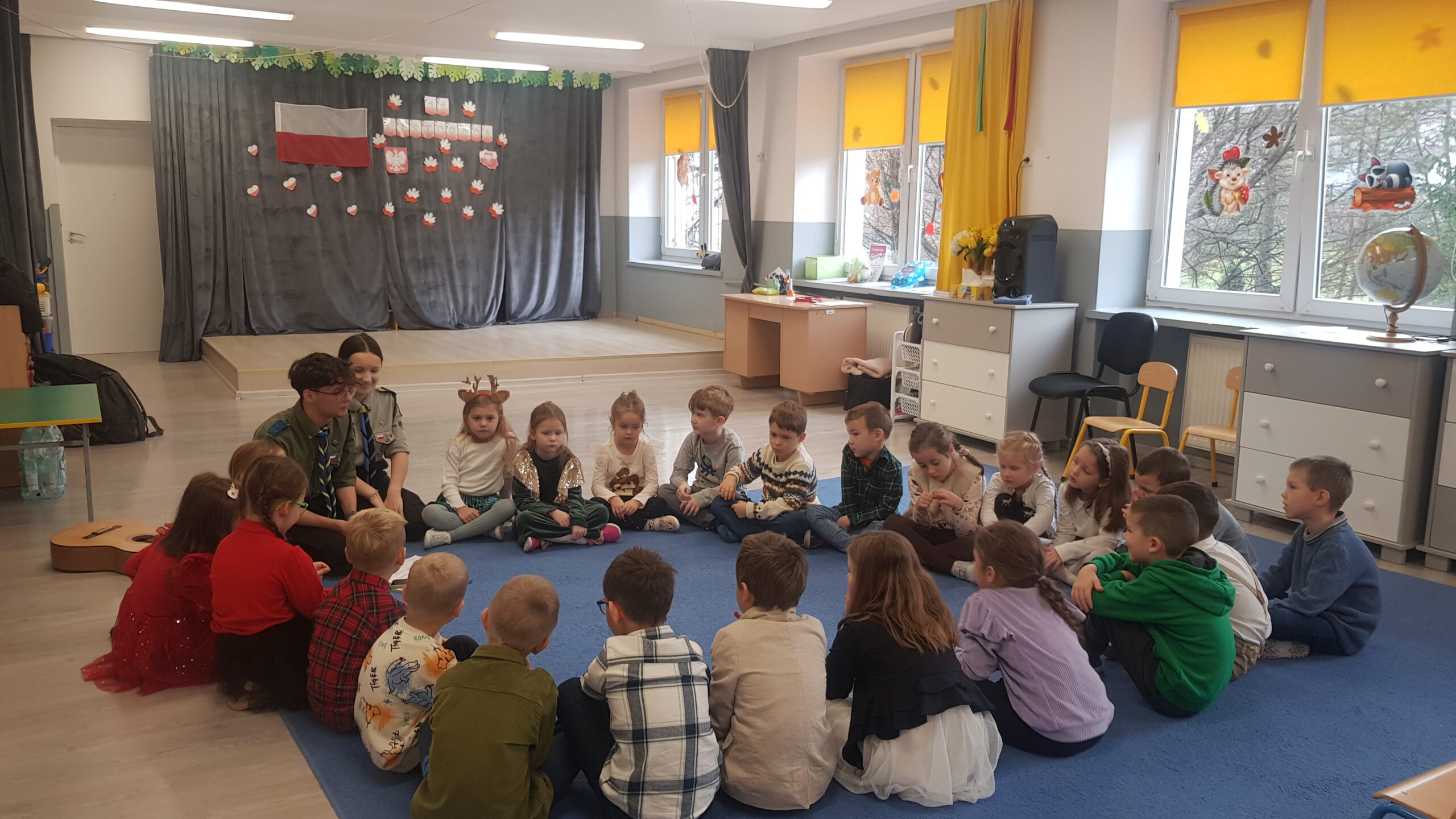 Jesienny szary dzień wcale nie musi być smutny i nudny. Przekonały się o tym dzieci ze starszych grup, kiedy nasze przedszkole 14 listopada odwiedzili niecodzienni goście – harcerze pwd. Tomasz Kot i pion. Joanna Ćwiklińska – 2 Szczep Drużyn Harcerskich Horyzont. Harcerze opowiedzieli dzieciom o swojej działalności i akcjach, w których biorą udział. Przedszkolaki dowiedziały się, kto może zostać harcerzem, czym charakteryzuje się strój harcerski oraz jak wyglądają obozy harcerskie. Nasi goście okazali się bardzo sympatycznymi i pełnymi energii ludźmi, więc spotkaniu towarzyszyły zabawy, tańce i śpiew przy akompaniamencie gitary. Spotkanie bardzo podobało wszystkim dzieciom. Niektóre z nich deklarowały, że w przyszłości też zostaną harcerzami. Dziękujemy wspaniałym harcerzom za przyjęcie naszego zaproszenia, poświęcony czas oraz ciekawe opowieści i zabawy.