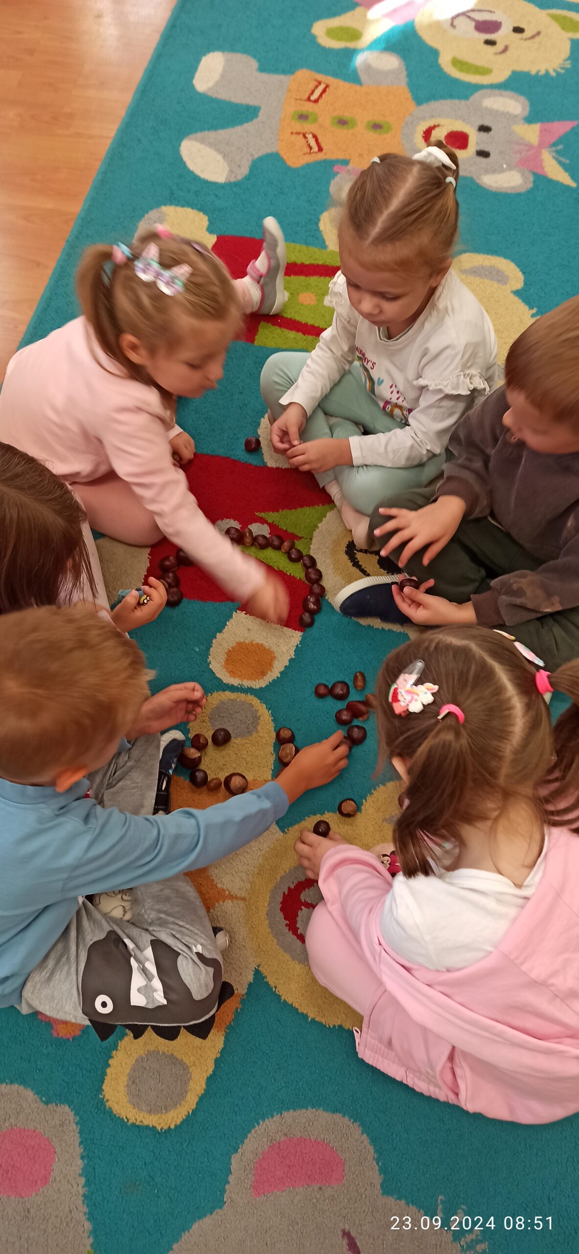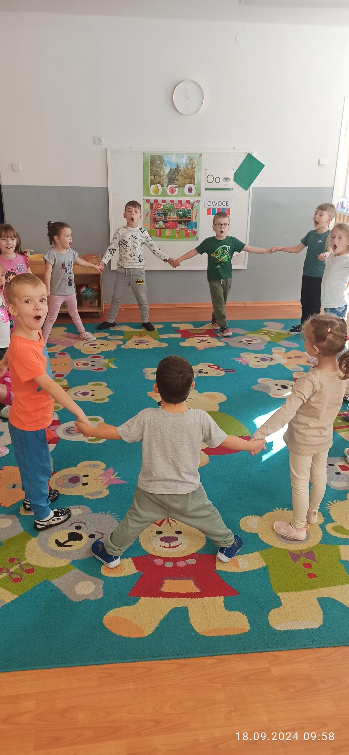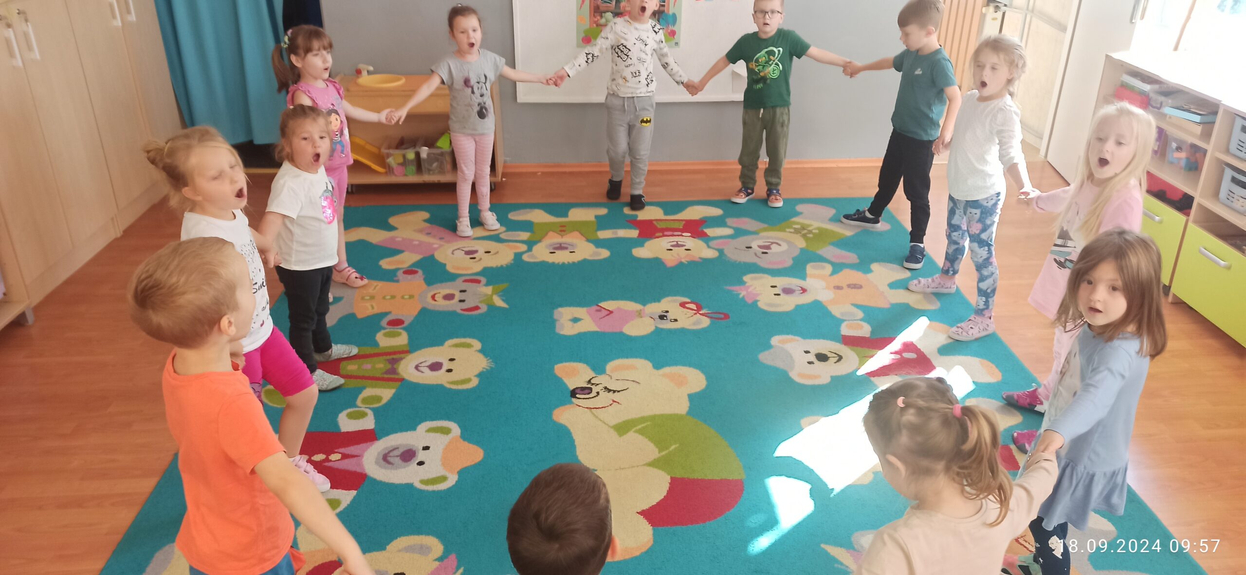We wrześniu misie pracowały nad muzyczną powitanką oraz uczyły się nowej piosenki „Niezwykły miś”. Utrwalały literę „O”  oraz liczbę „1” i „2” wykorzystując m.in. dary jesieni czy zabawy ruchowe i słuchowe. Dzieci podzieliły się wspomnieniami z wakacji nawiązują do mijającej pory roku. Wspólnie dopasowały symbole pór roku: lata i jesieni. W zespołowej zabawie przypomniały sobie nazwy części ciała, kształtowały orientację w schemacie własnego ciała i przestrzeni oraz wiedzą jak prawidłowo zadbać o higienę.