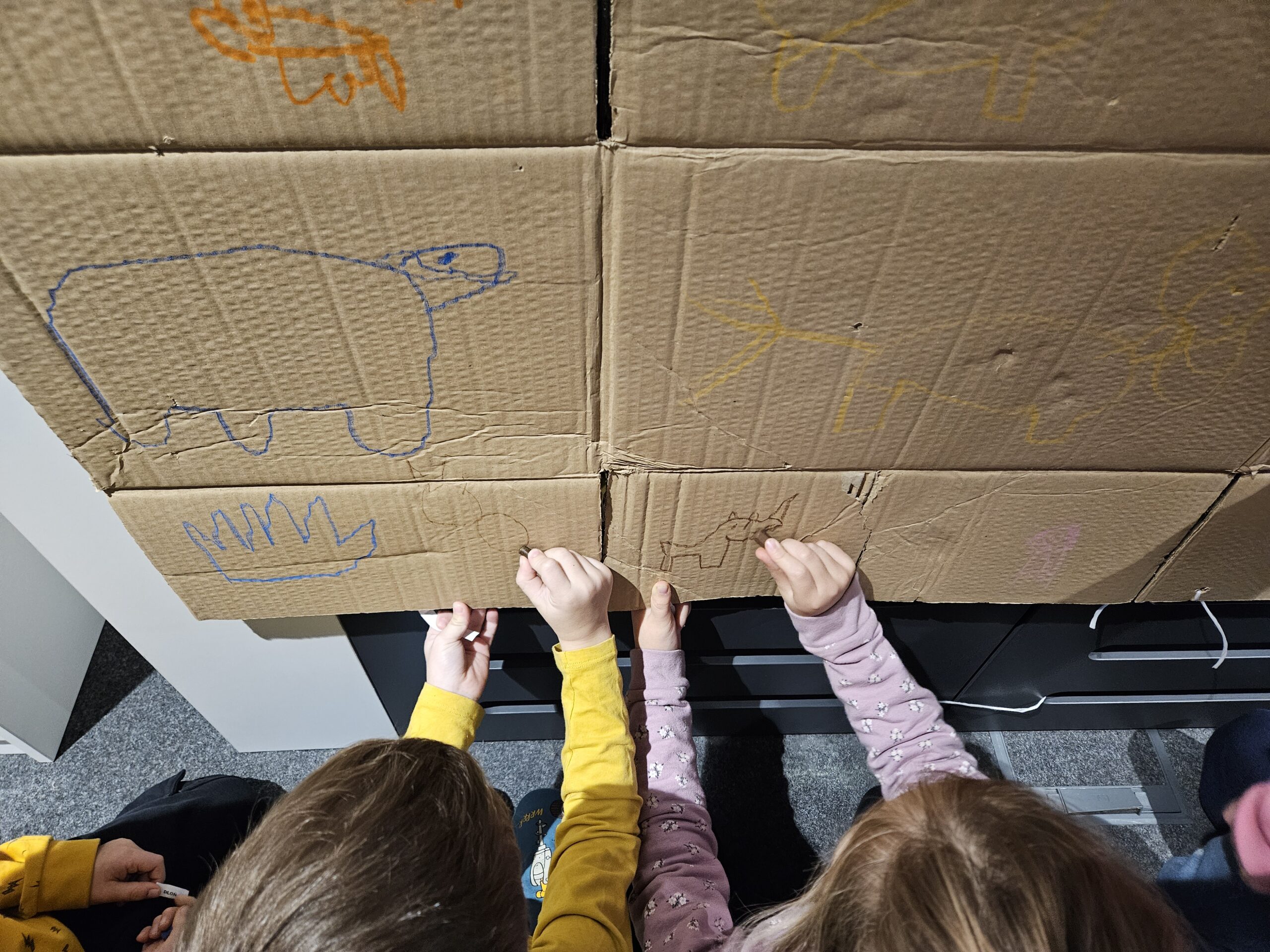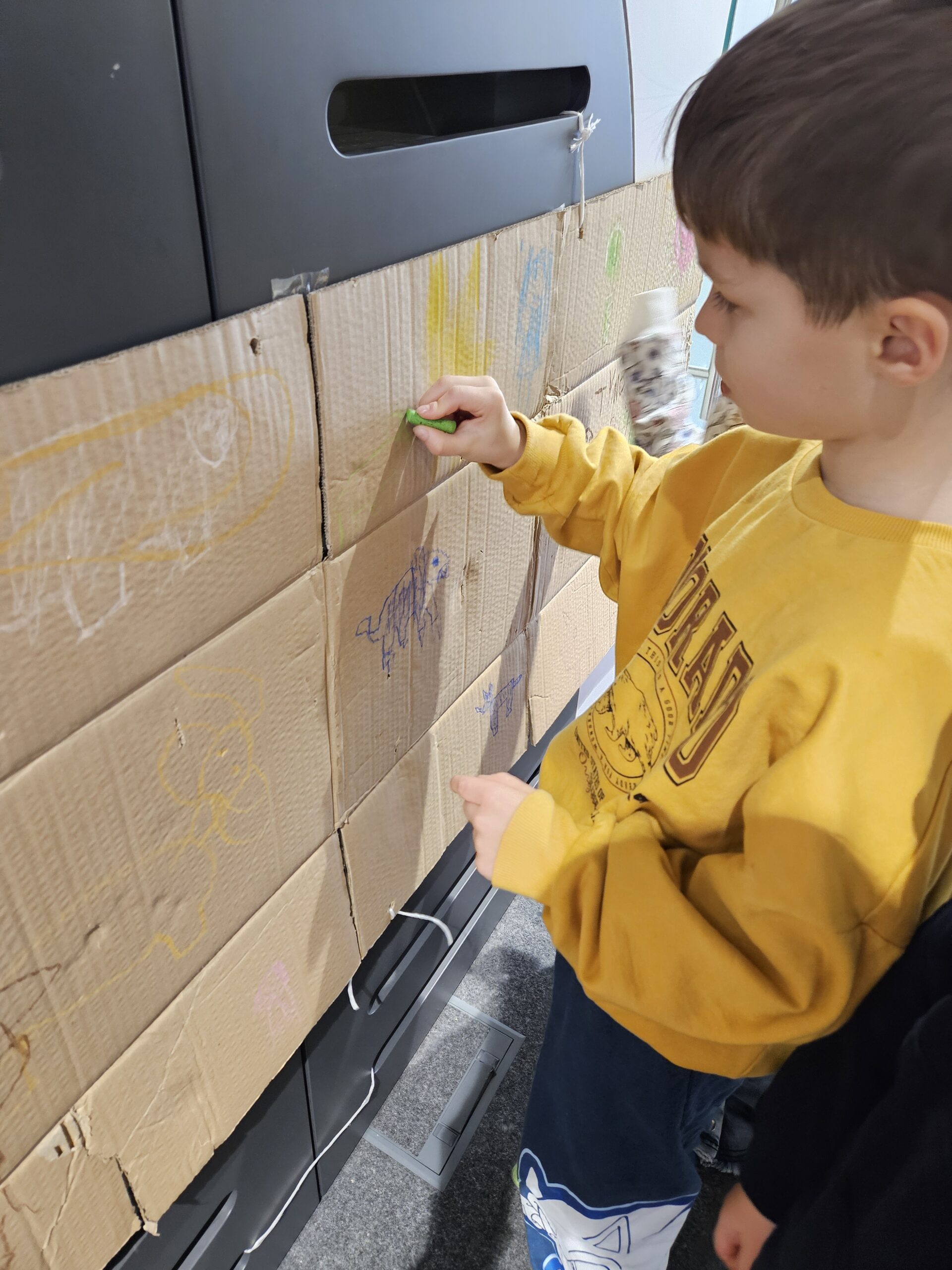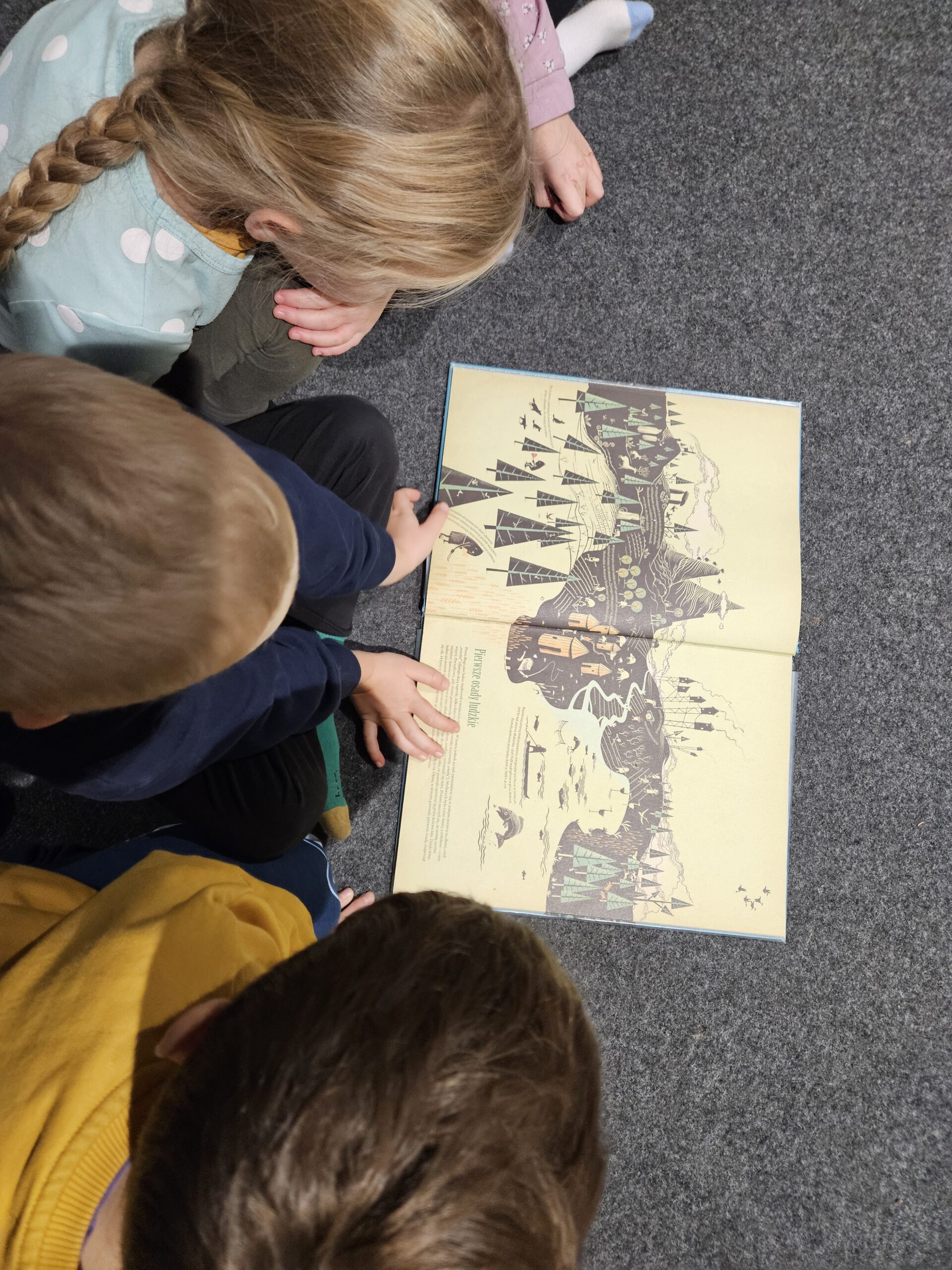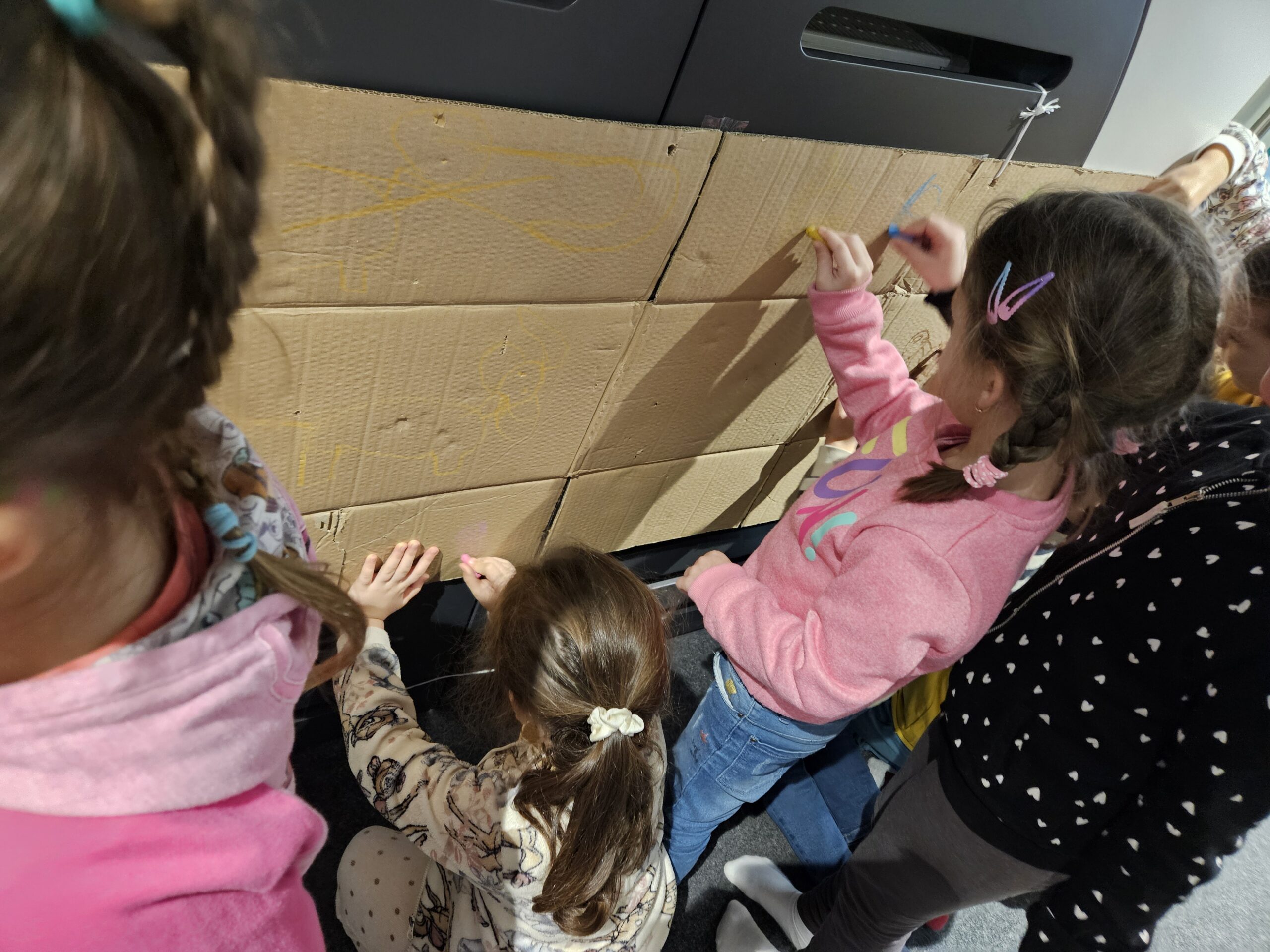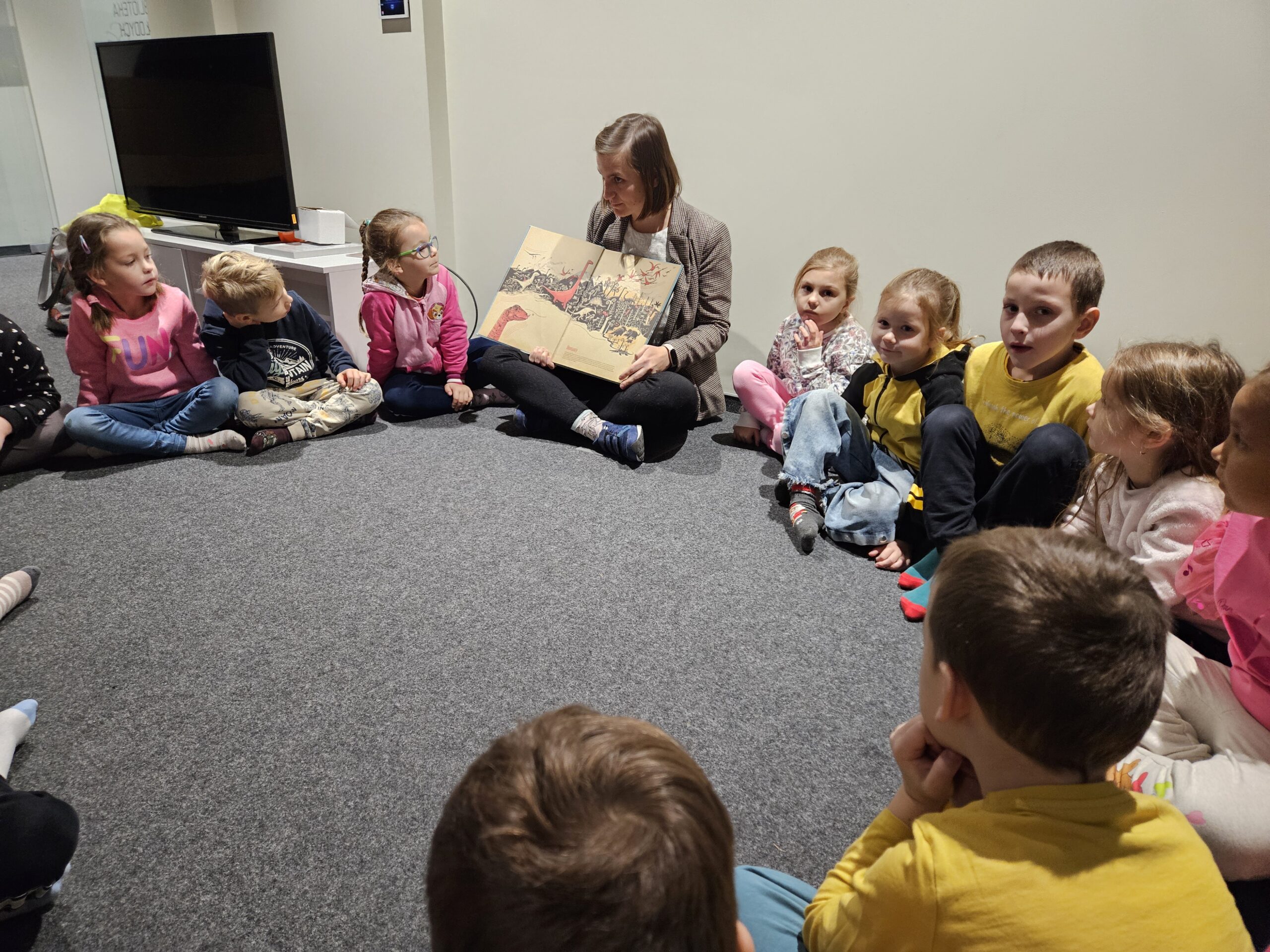 Dzieci z grupy Zajączki odwiedziły Bibliotekę Suską aby zobaczyć jak przedstawiana jest prehistoria w książkach. Z zainteresowaniem oglądały przygotowane przez Panią Ewę egzemplarze dotyczące prehistorii oraz poznały historię Inki, która bardzo wytrwale uczyła się malować mamuty. Przedszkolaki również próbowały samodzielnie wykonać jaskiniowe rysunki. Wspólne jaskiniowe dzieło ozdobiło wnętrze biblioteki. Dzieci z zadowoleniem wróciły do przedszkola, a swoja wiedzą i spostrzeżeniami dotyczącymi odległych tysiącleci dzieliły się wzajemnie podczas realizacji tematu kompleksowego „W prehistorycznym świecie”.