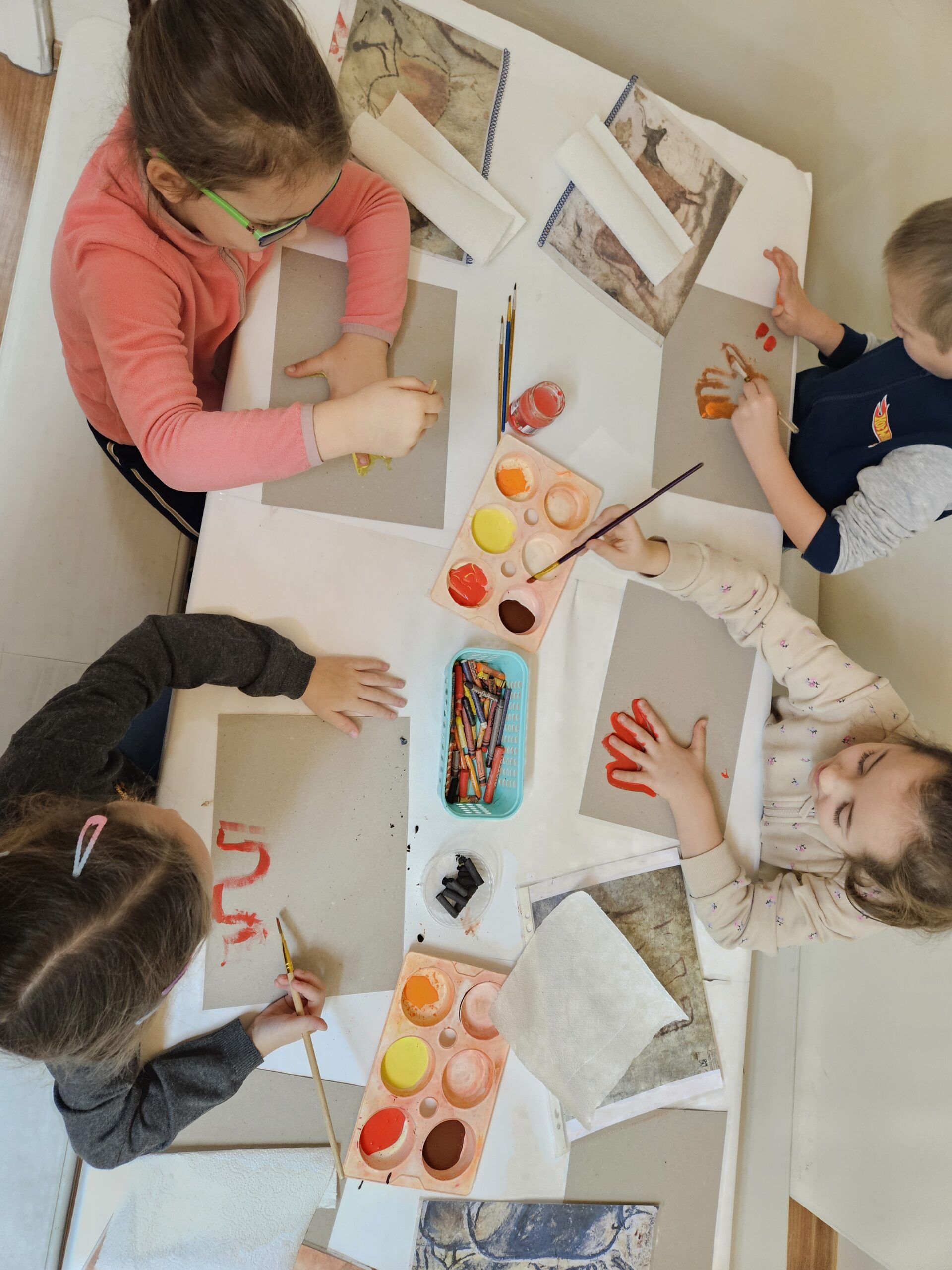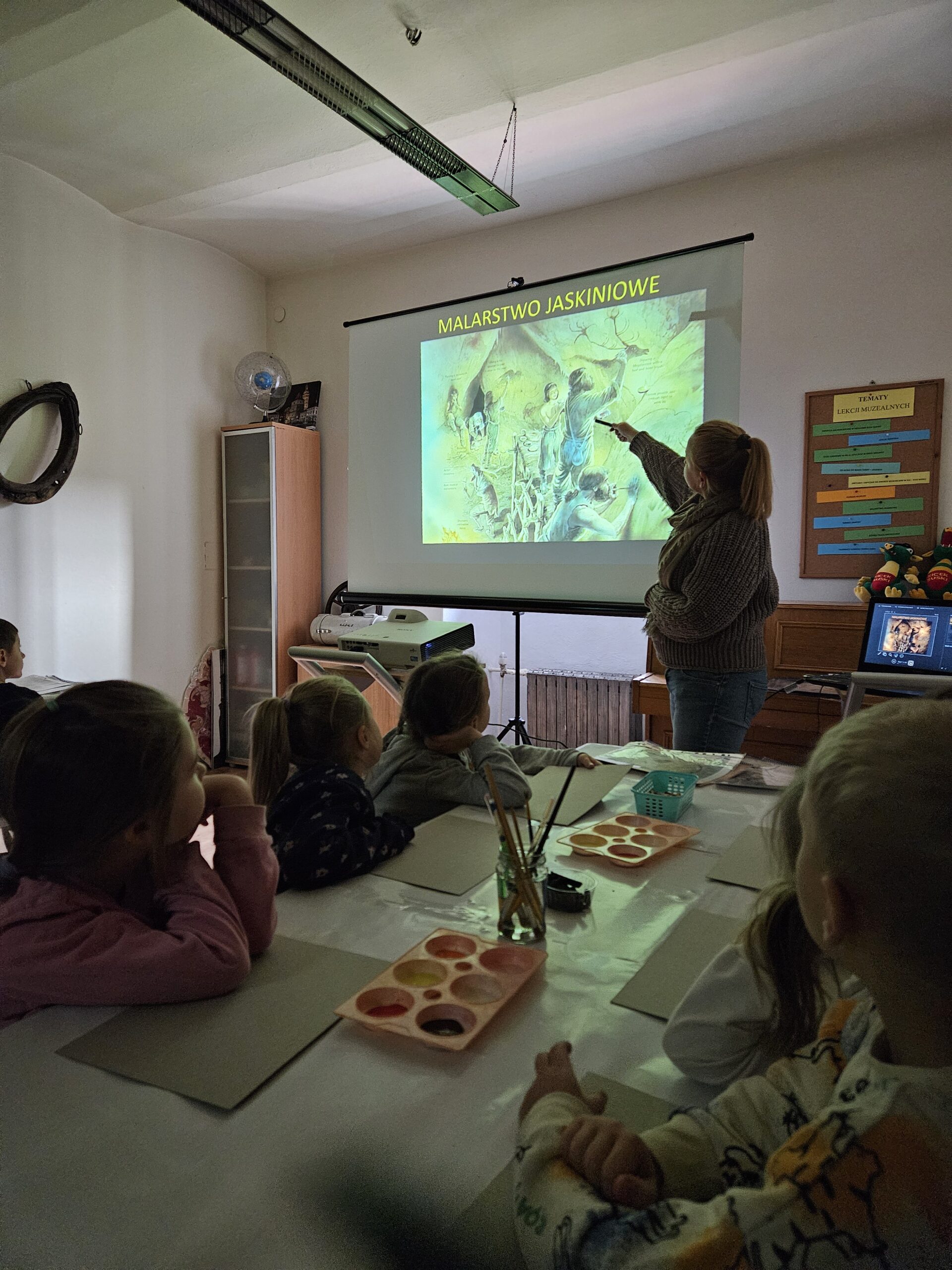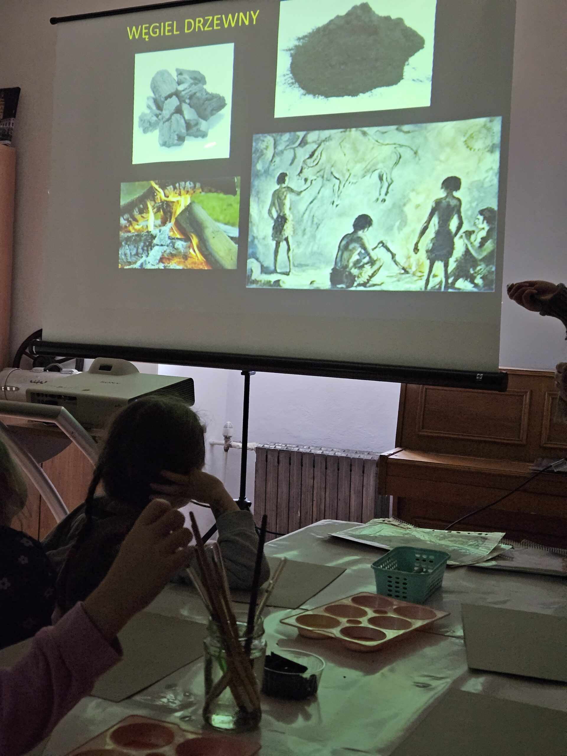 27 listopada dzieci z grupy Zajączki uczestniczyły w zajęciach edukacyjnych „Malarstwo jaskiniowe” . Zajęcia poprzedzone były oglądaniem wystawy archeologicznej ze zgromadzonych eksponatów naszego regionu. Dzieci z zainteresowaniem oglądały i słuchały a następnie w skupieniu tworzyły własne prehistoryczne kształty, symbole z których powstały niezwykłe malowidła.