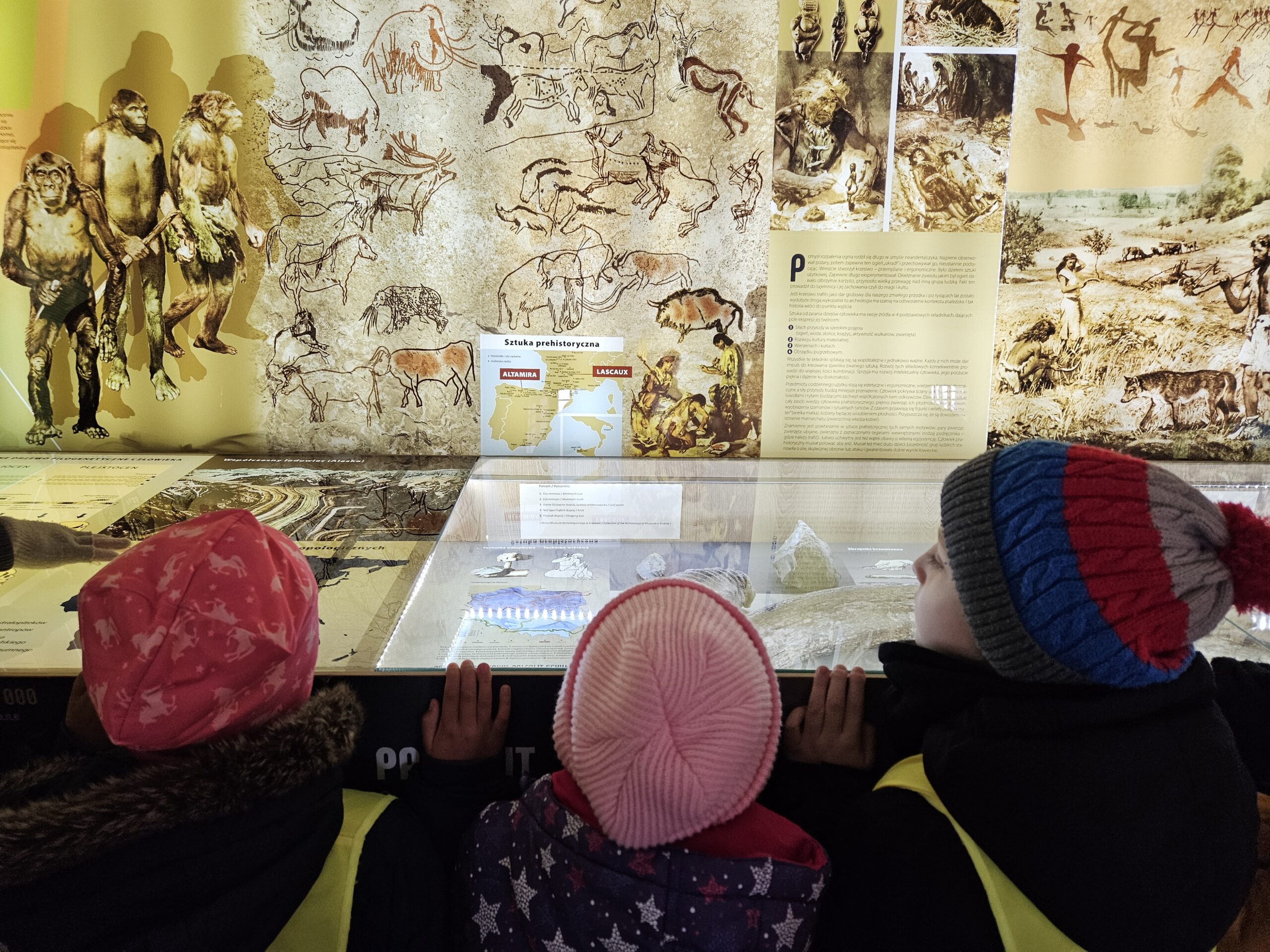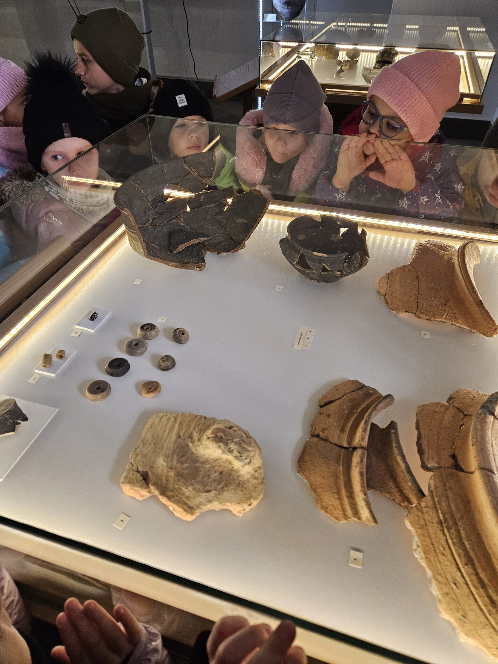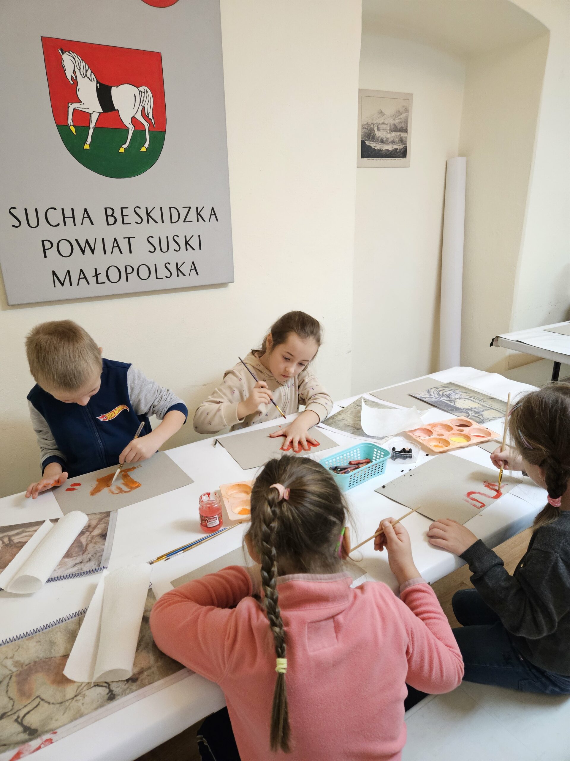 27 listopada dzieci z grupy Zajączki uczestniczyły w zajęciach edukacyjnych „Malarstwo jaskiniowe” . Zajęcia poprzedzone były oglądaniem wystawy archeologicznej ze zgromadzonych eksponatów naszego regionu. Dzieci z zainteresowaniem oglądały i słuchały a następnie w skupieniu tworzyły własne prehistoryczne kształty, symbole z których powstały niezwykłe malowidła.